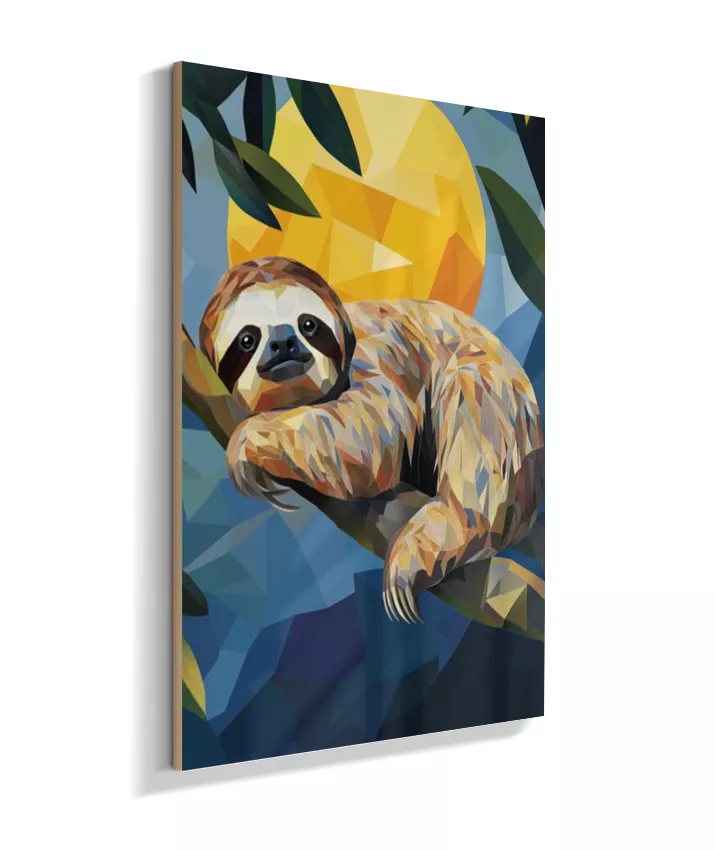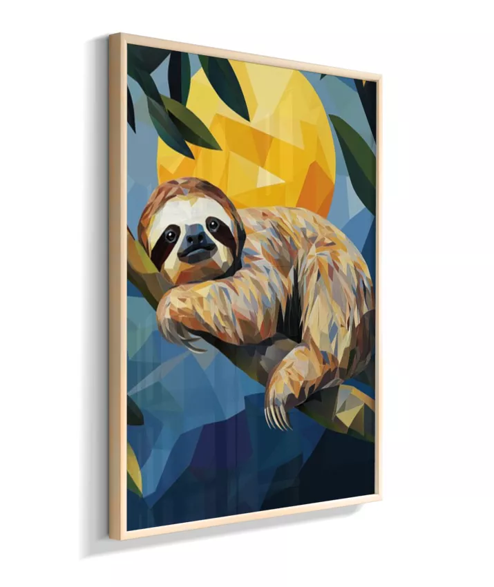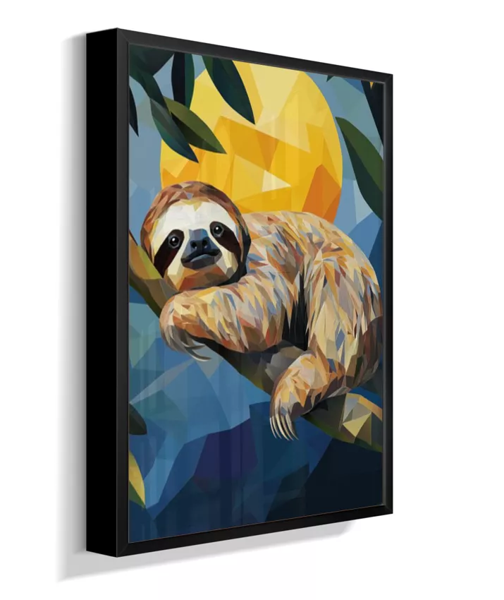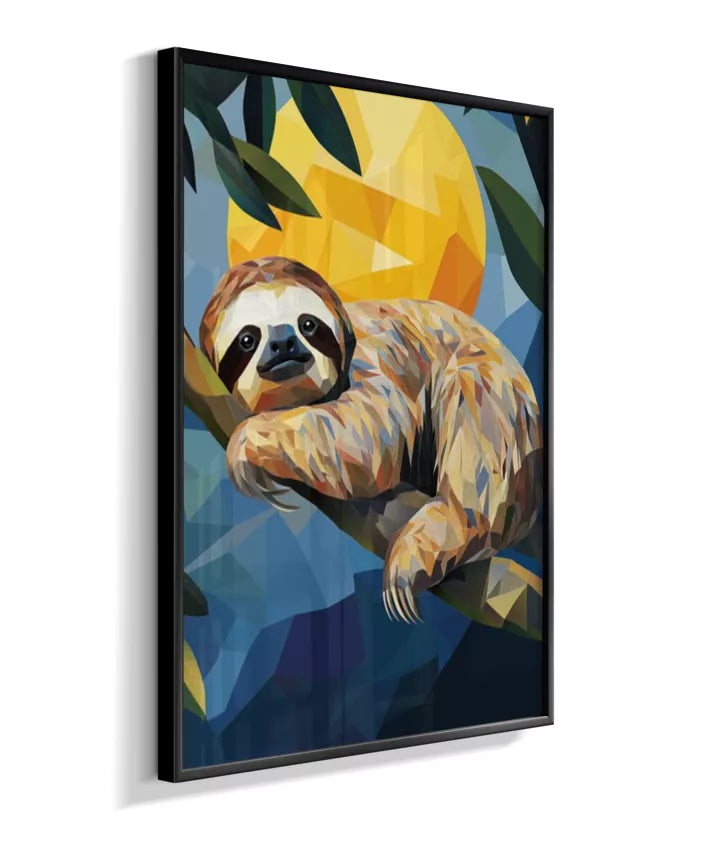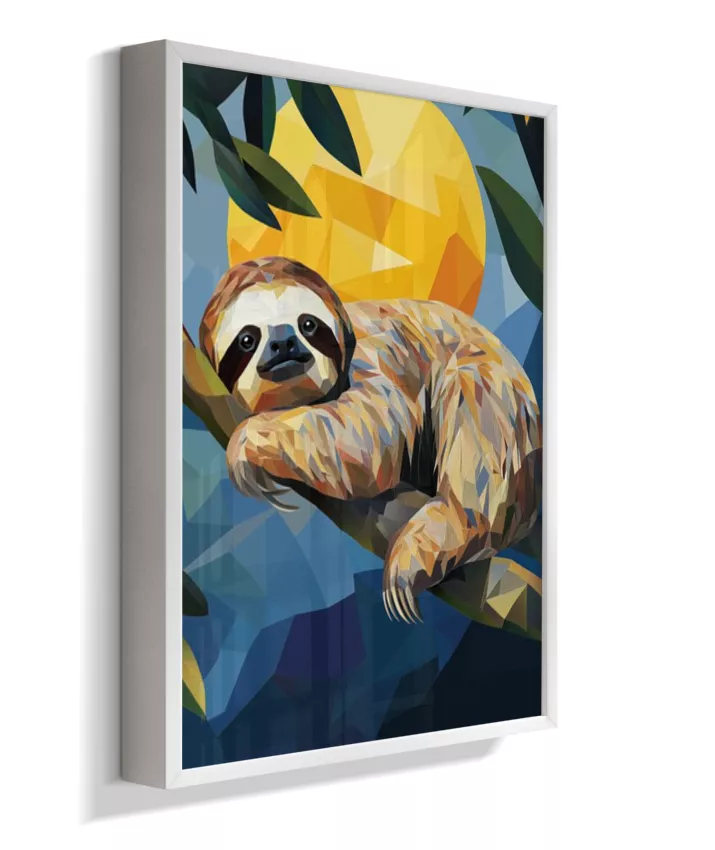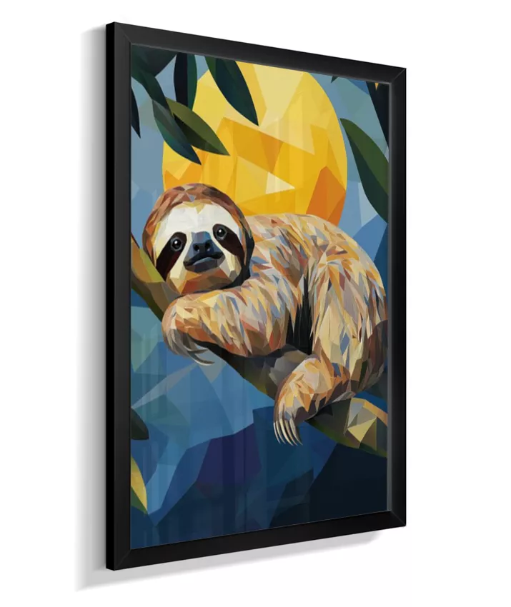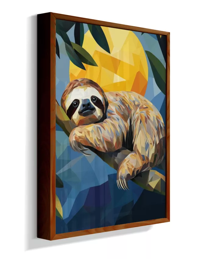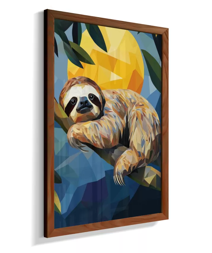 Meiga, delicada, suave. A preguiça sussurra sua existência frágil mas resiliente. Sua leveza no galho parece impossível—como se pudesse desaparecer a qualquer momento. Amarelo-ouro banhado pelo sol tropical que a aquece, seu verde envolvente que a protege, azul-céu acima que a contempla, vermelho-coração que bate lentamente em ritmo frágil mas constante. Sua fragilidade NÃO é fraqueza—é adaptação perfeita. Seus braços delgados seguram-se ao galho com delicadeza absoluta. Seu rosto macio fala de ternura. Seus olhos suaves observam mundo em câmera lenta. Geometrias suaves dançam em formas arredondadas. Nenhuma agressividade. Apenas presença gentil. Apenas existência frágil que pede proteção. Apenas amor em forma de criatura.