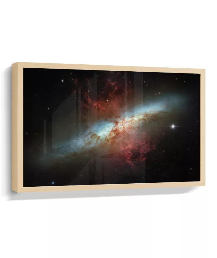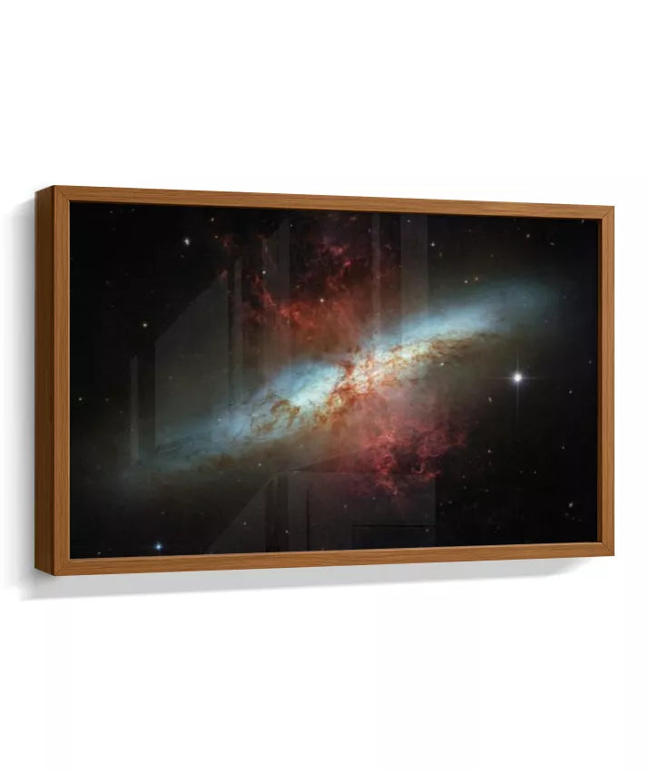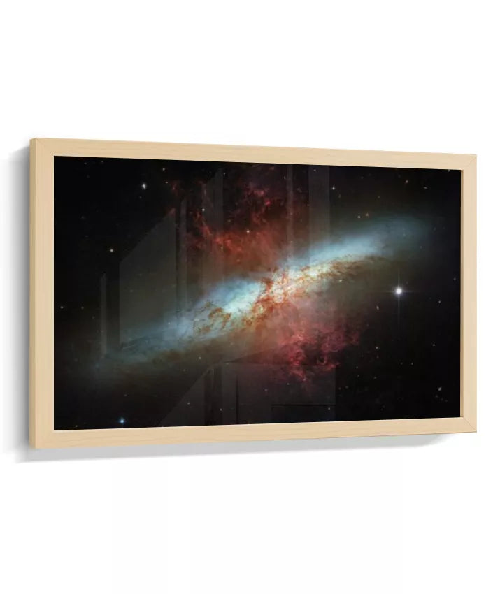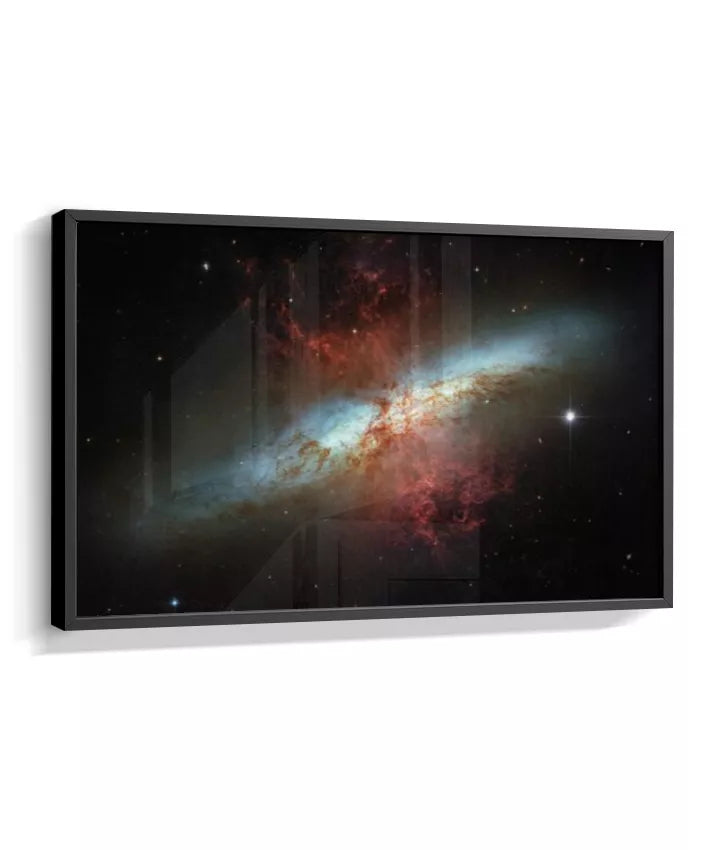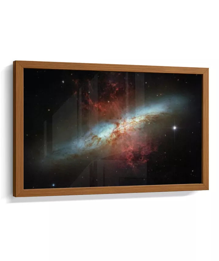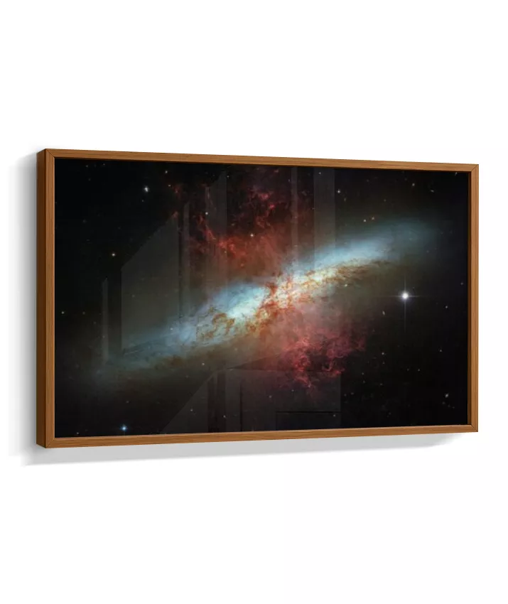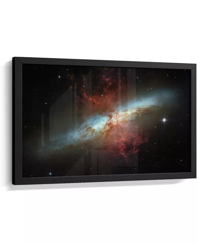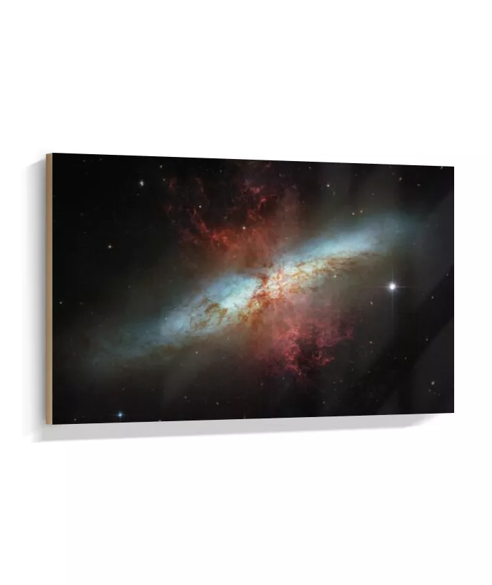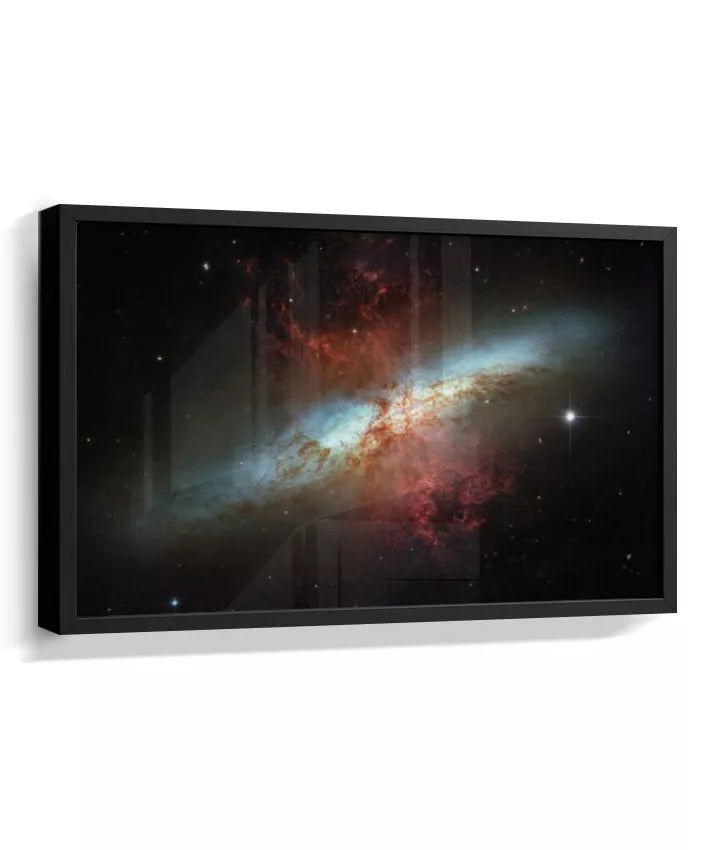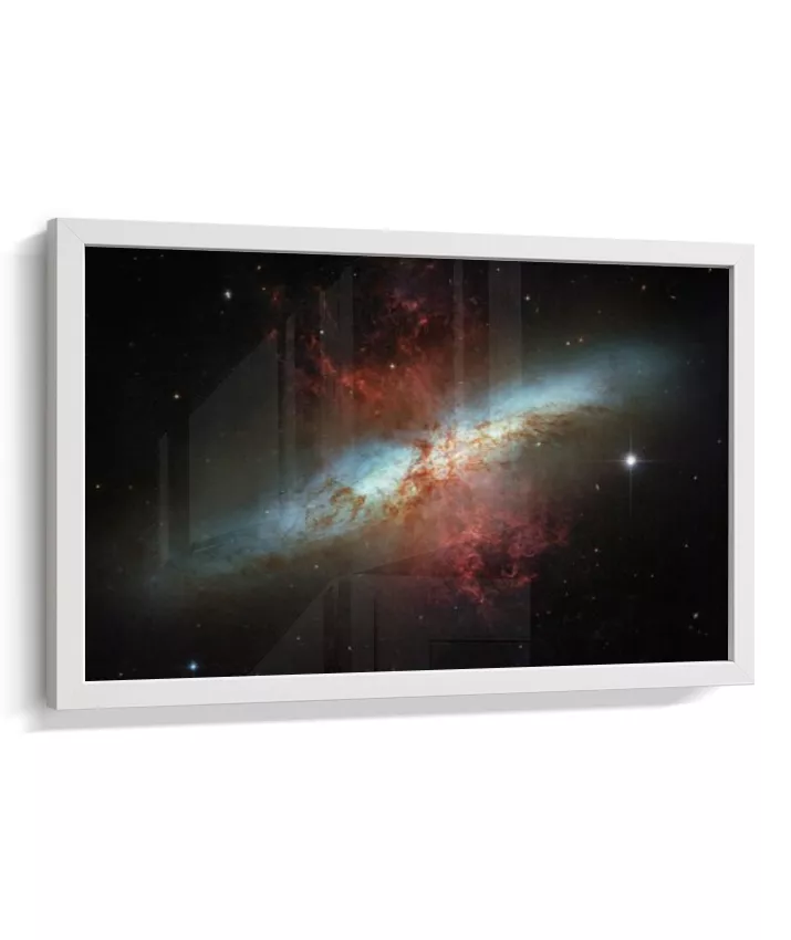 Esta imagem apresenta um registro real do espaço profundo capturado pelo Telescópio Espacial Hubble. Trata-se da galáxia Messier 82 (M82), conhecida como Galáxia do Charuto — um sistema galáctico visto de perfil, localizado a cerca de 12 milhões de anos-luz da Terra. A M82 é uma galáxia de intensa formação estelar, onde bilhões de estrelas nascem em ritmo acelerado. As regiões avermelhadas visíveis na imagem indicam enormes fluxos de gás e poeira sendo expelidos do núcleo galáctico, resultado de processos energéticos extremos. Mais do que um dado científico, esta imagem nos confronta com a escala do universo e com forças naturais que operam muito além da experiência humana. Cor, contraste e estrutura não são efeitos decorativos, mas traduções visuais de dados reais, revelando fenômenos invisíveis ao olho humano. NASA / ESA — Hubble Space Telescope