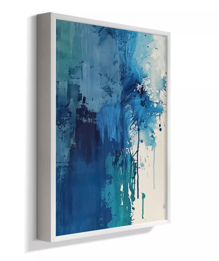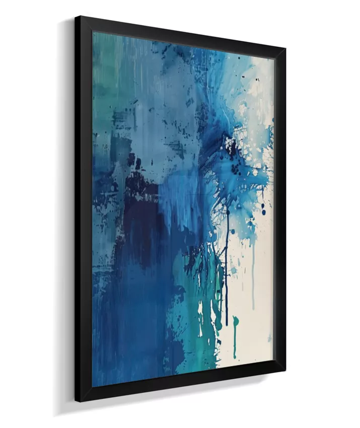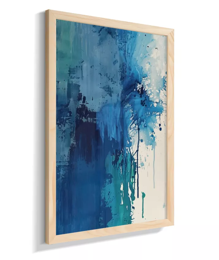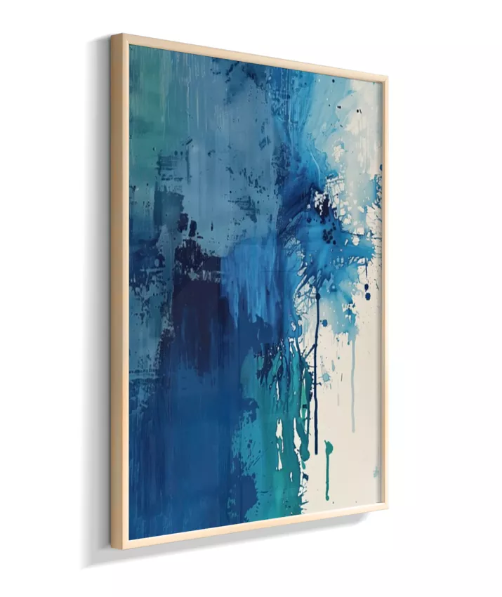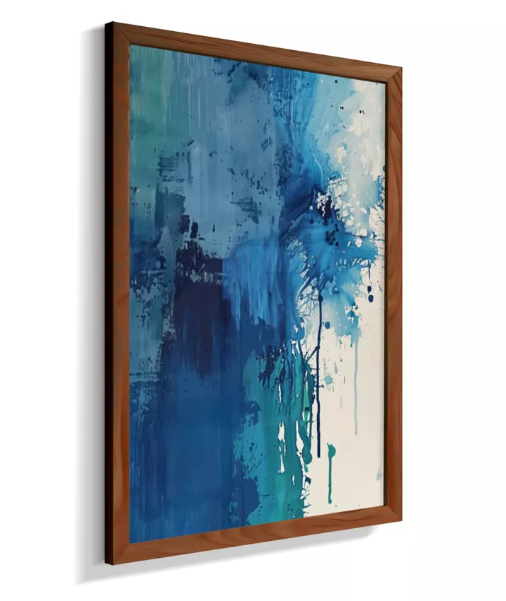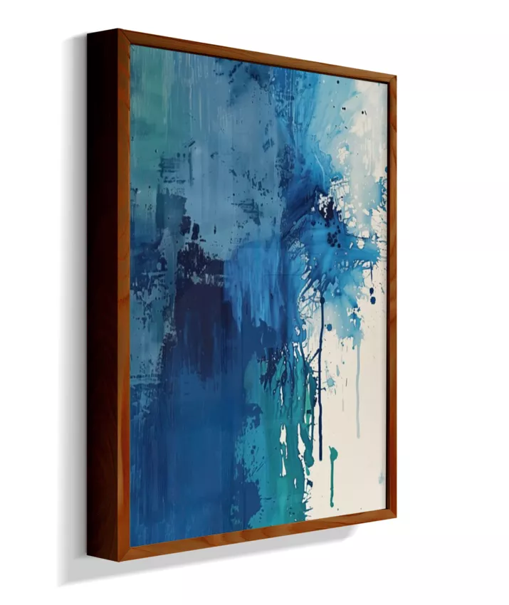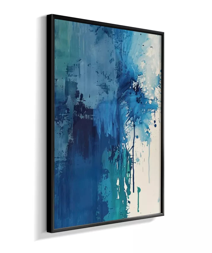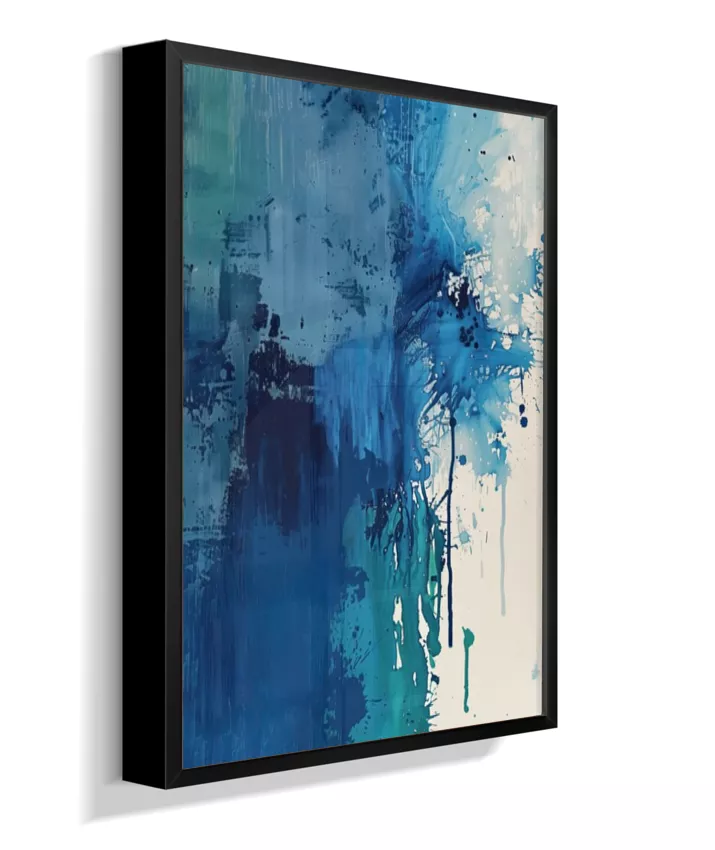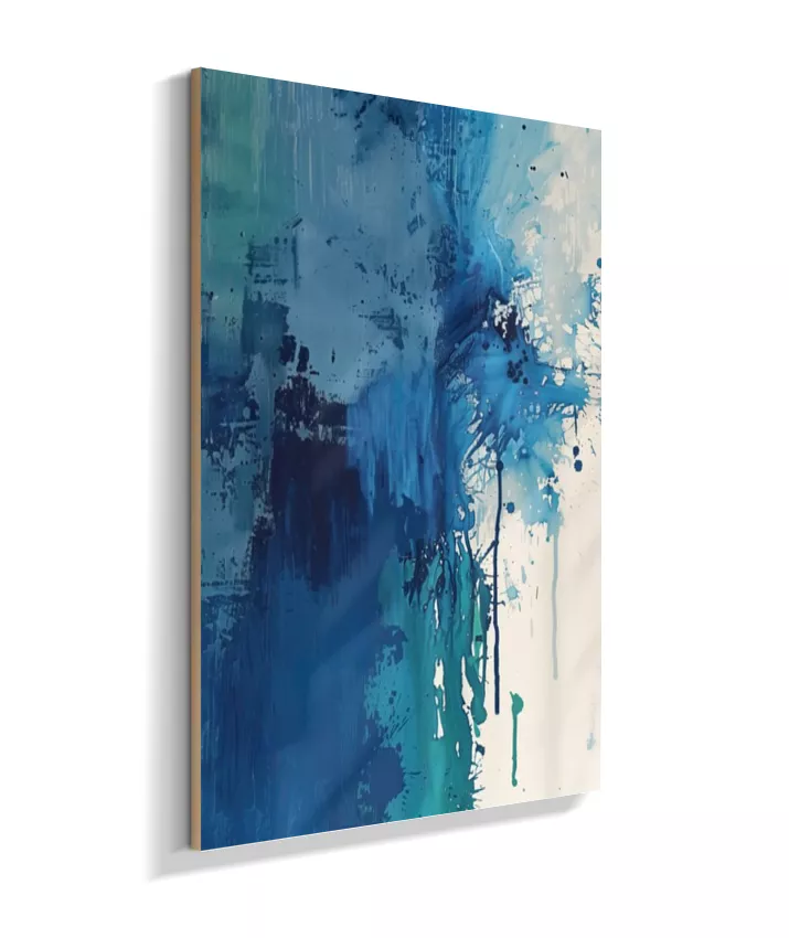 Estrutura e dissolução coexistem. Uma coluna azul densa ancora a composição à esquerda enquanto o canto superior direito explode em caos gestual — respingos, manchas, pinceladas fragmentadas. O momento em que a forma se rompe. Técnica: Contraste entre áreas de textura espessa (impasto) e zonas de dispersão com spattering irregular. Múltiplas passadas de pigmento. Versatilidade: A mais dramática da coleção. Forte presença individual; em conjunto, adiciona tensão narrativa.