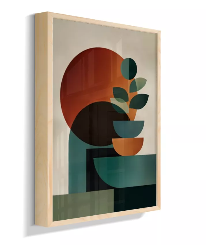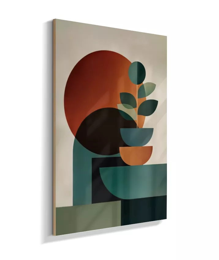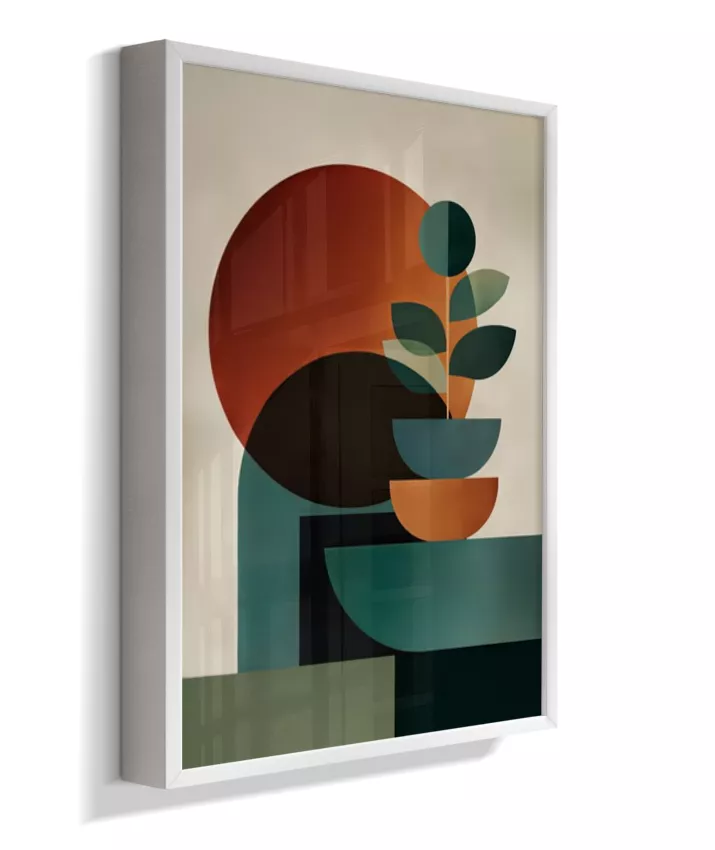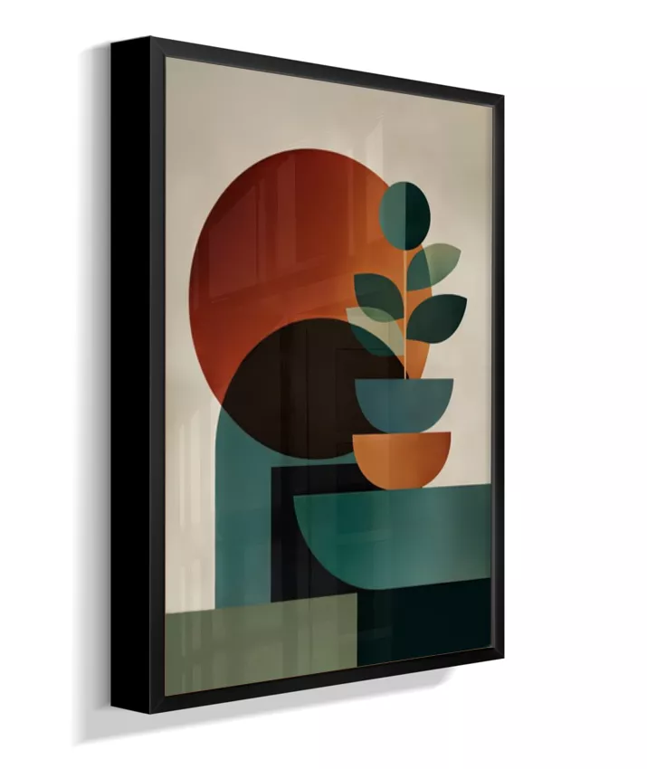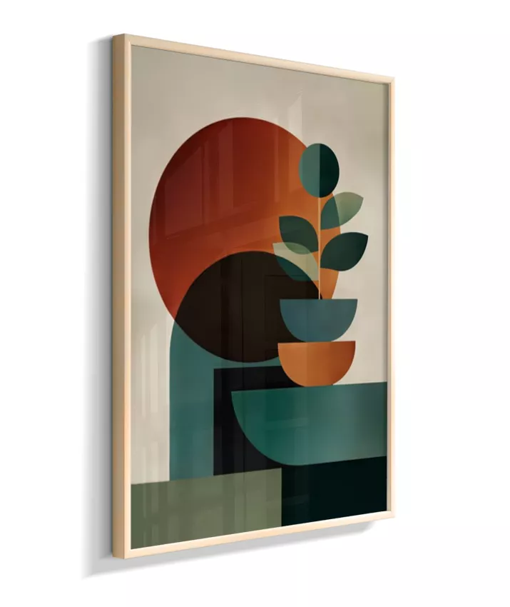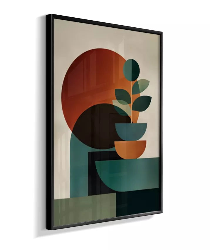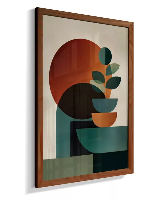 Uma composição abstrata que une formas geométricas suaves e círculos expressivos, criando uma atmosfera de harmonia, cálma e sofisticação. A paleta em tons quentes de laranja terroso, verde profundo e bege neutro traz aconchego e elegante minimalismo ao ambiente, enquanto o design contemporâneo dialoga com estilos escandinavo e mid-century modern. Ideal para salas, quartos, escritórios ou ambientes que buscam um toque artístico sofisticado com tonalidades acolhedoras e equilibradas
