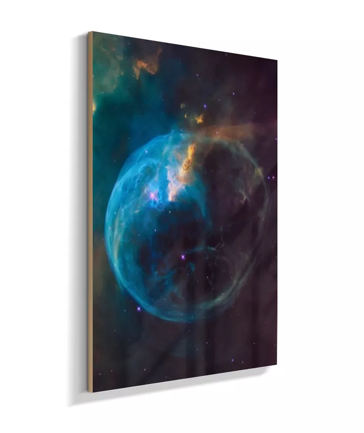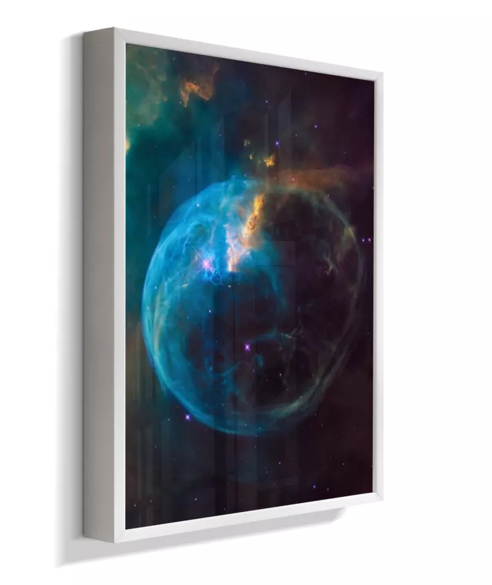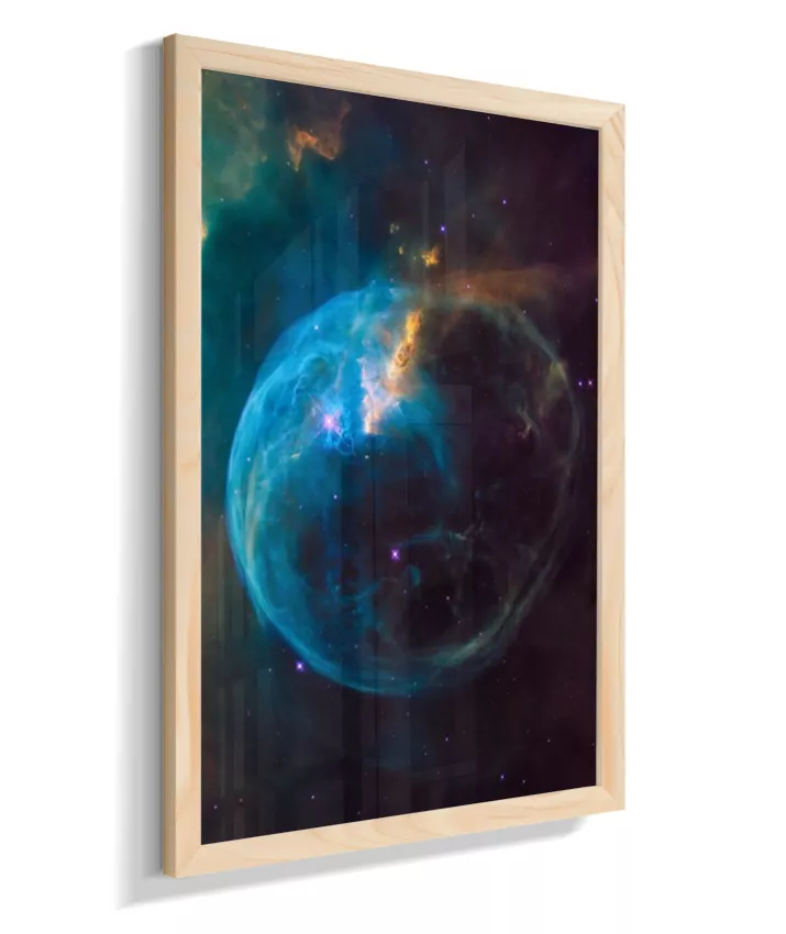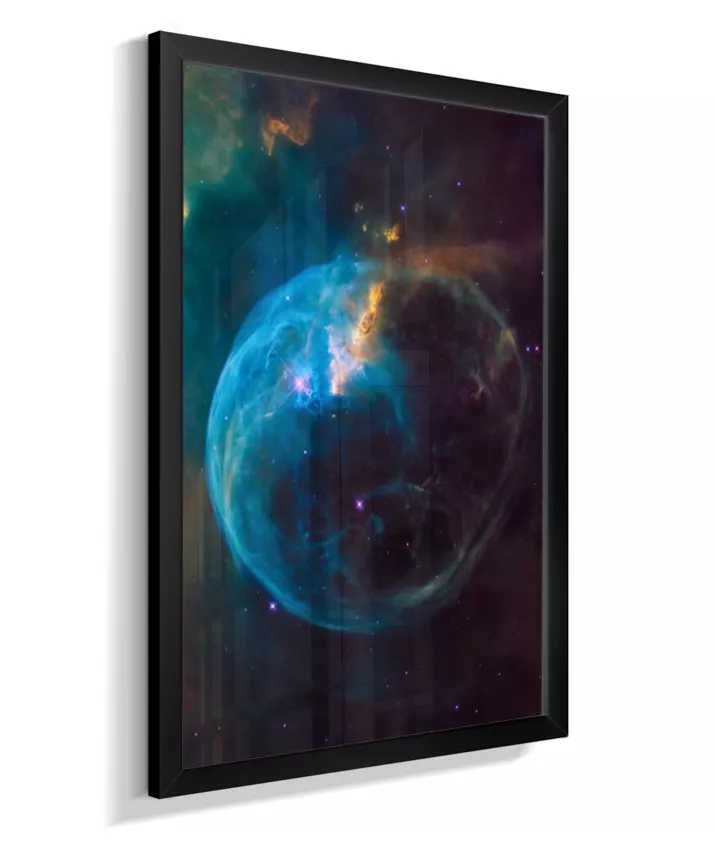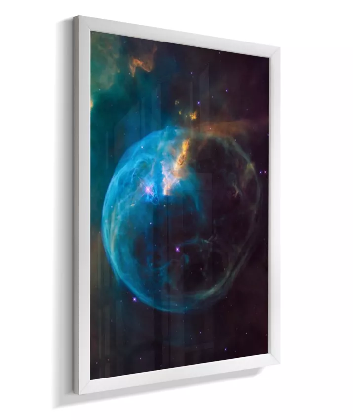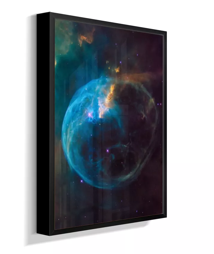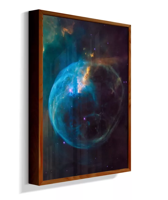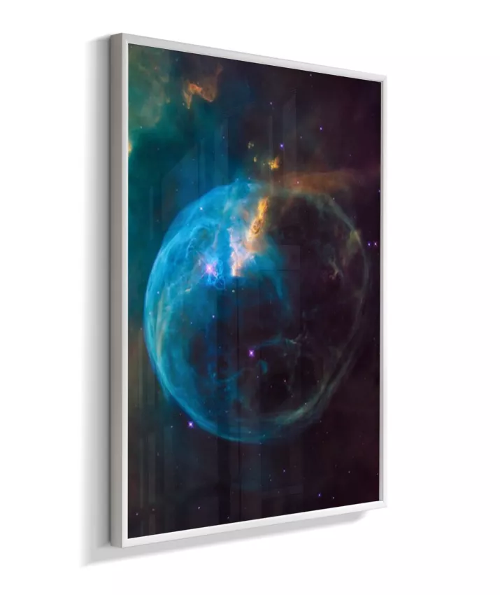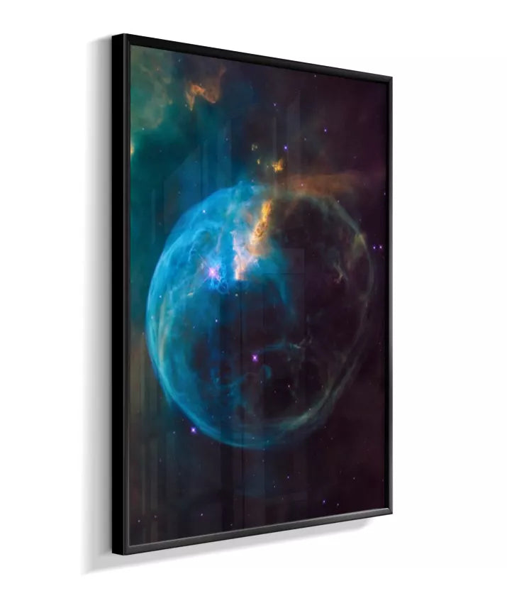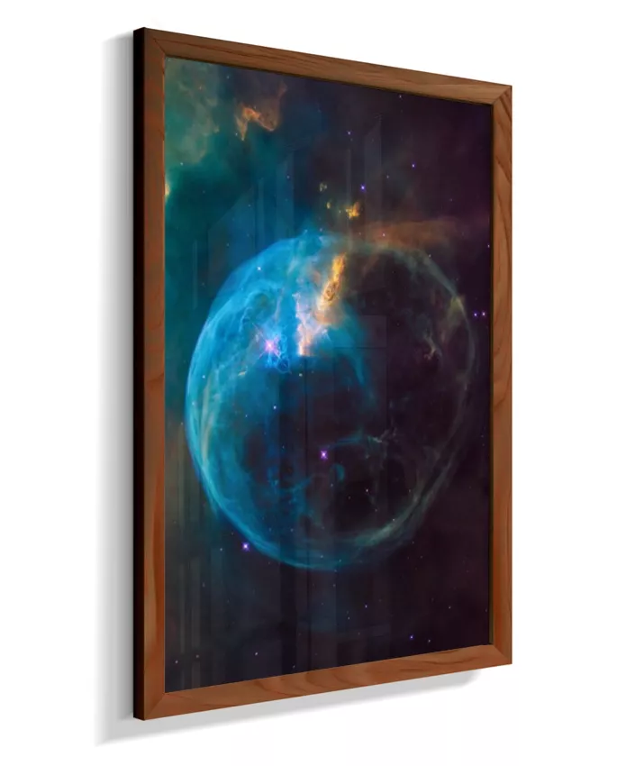 Deixe seu ambiente mais inspirador com esta imagem da Nebulosa da Bolha (NGC 7635), um espetacular berçário de estrelas localizado na constelação de Cassiopeia, a cerca de 7.000 anos‑luz da Terra. A estrutura em forma de bolha é esculpida pelos ventos estelares de uma estrela jovem e extremamente quente, que “empurra” os gases ao redor e faz a nuvem brilhar em tons de azul, roxo e dourado.